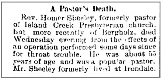 And yet, Homer appears in the 1900 Census, alive and well and living in Springfield, Ohio. And a July 22, 1924 article in the Akron (Ohio) Beacon Journal mentions a visit to him in Steubenville from his sister and brother-in-law. And, oh by the way, there was this gravestone with the rest of the Sheeley family in Fredericksburg, Ohio with a death date of 1928: