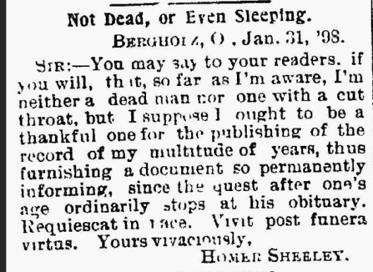 I love the quirky items I find searching newspapers. I completely love that Homer signed his letter to the editor “Vivaciously Yours.” To find a bit of a sense of humor is a special treat–who knew? And the famous Mark Twain line about his own mis-reported death was first published in June 1897. Was Homer familiar with it and referring to it in his own response just a few months later?
