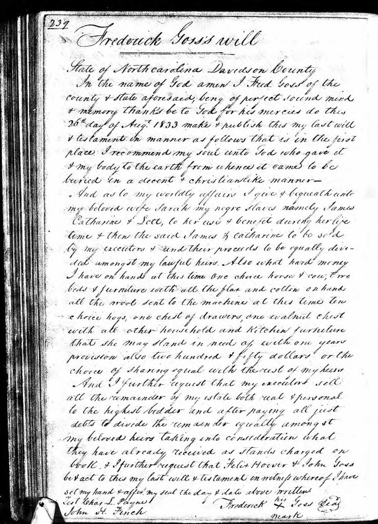 I’ve just found the will of my 5th great grandfather, Frederick Goss (1766-1833) and the estate inventory of his widow, Sarah (Elston) Goss (1772-1837) in Davidson County, North Carolina. Frederick’s 1833 will includes the following: