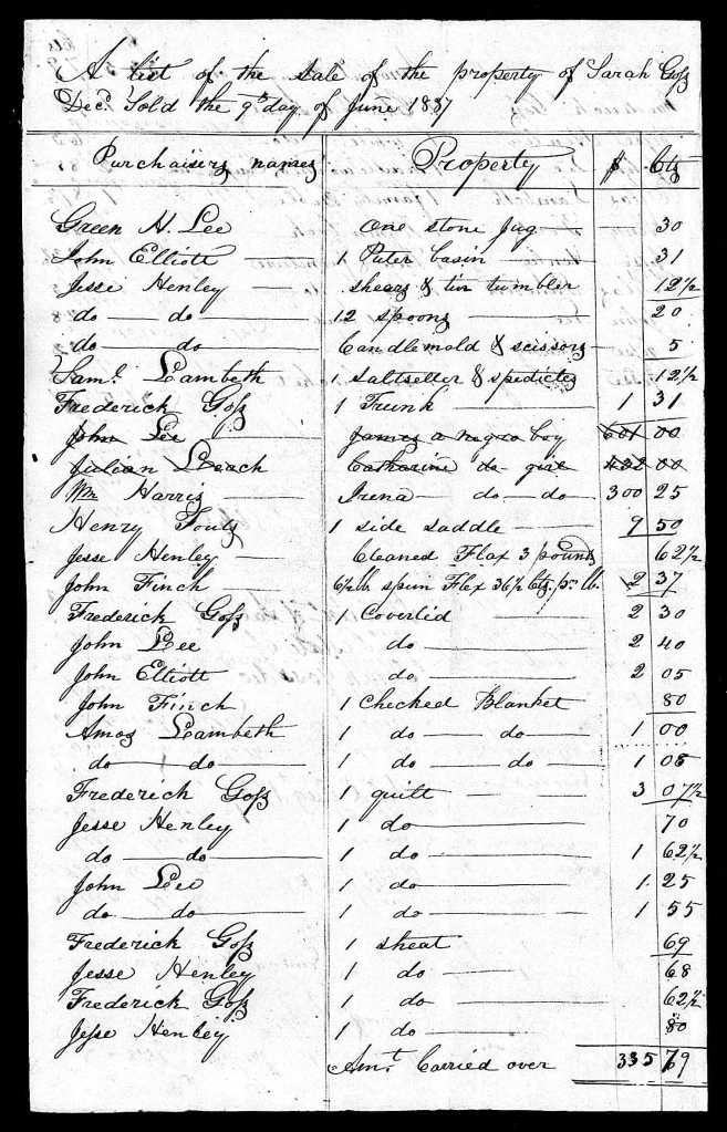 The inventory of Sarah’s estate includes “A list of the sale of the property of Sarah Goss deceased sold the 9th day of June 1837.”