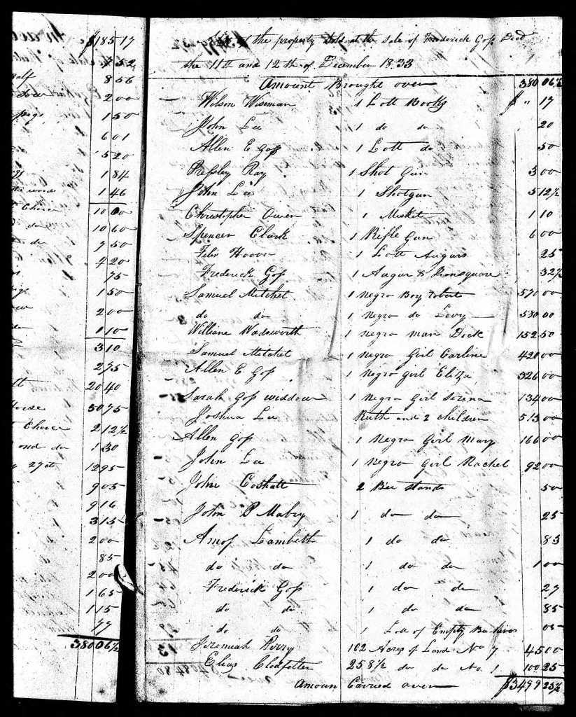 Updating this February 4, 2023 to add the names of additional people listed in Frederick Goss’s probate records as having been sold at an estate sale on 11 and 12 December, 1833.
