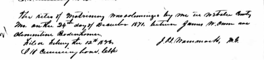 On Christmas Eve, 1871, Clemmie (17) and James Washington Owen (23) were married in Marshfield. Like many of Clemmie’s relatives, James was born in Rowan County, North Carolina, and moved west to Greene County, Missouri with his family as a child. At the time of their marriage James and five younger siblings were living on the family farm, where he was a farm hand.