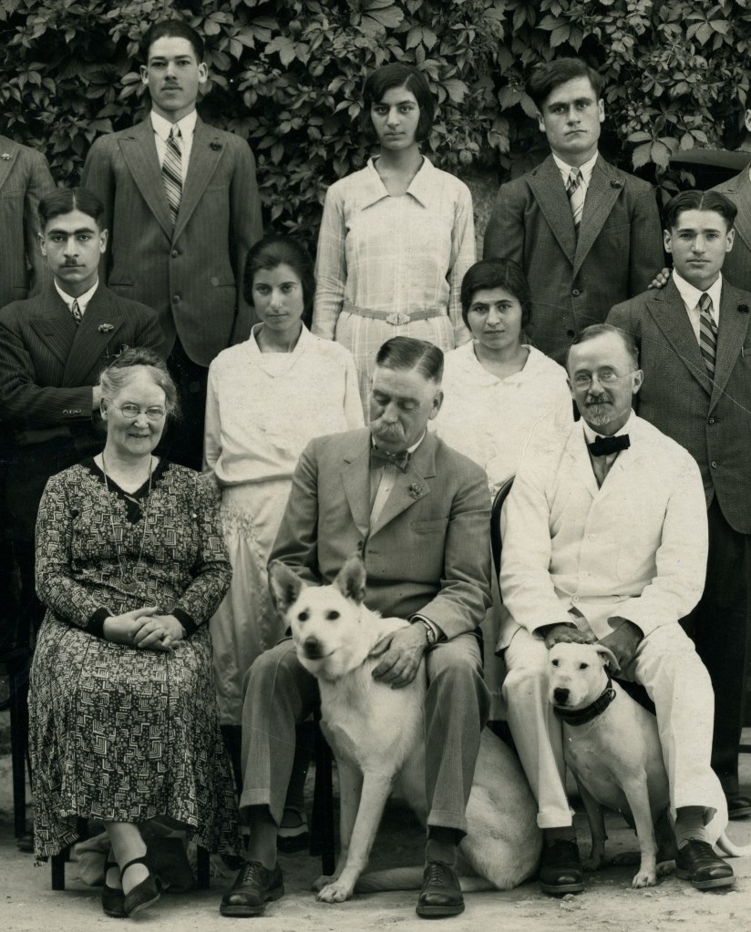 Mum’s paternal grandparents, Daniel and Emily Oliver, ran an orphanage and school in Ras el Met’n, in the mountains outside Beirut. Daniel always had several dogs, and the annual large group photographs of the students, faculty and staff, all feature him, front and center, with a couple of dogs at his feet. My mother would add that she remembers him being harsh with the dogs, but he certainly appeared attentive in the photos, often looking fondly at the dogs and not the camera.