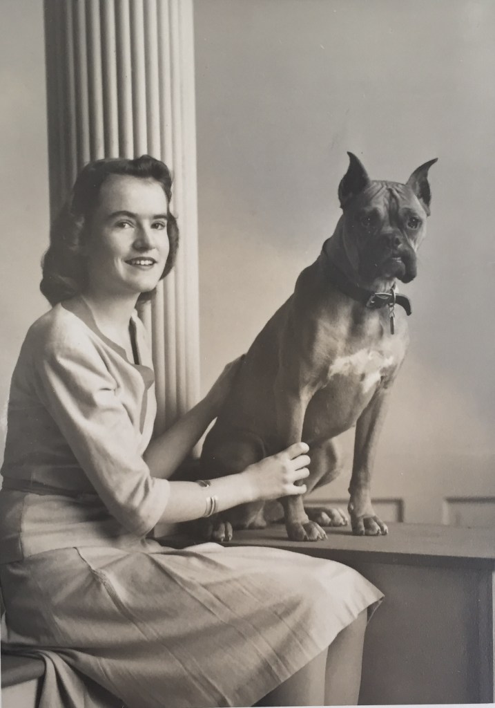 My Oliver grandparents had many beloved dogs living in Beirut when Mum was a child. I remember tales of Alsatians, (as they were known to them, German Shepherds to us in the U.S.)–Lorna, Ronnie, Topsy. More on their adventures in another post. Later there were boxers, starting with Pronto. And when my grandparents settled in New England there were came Tess and my childhood friends, Judy, Penny, and Jenny.