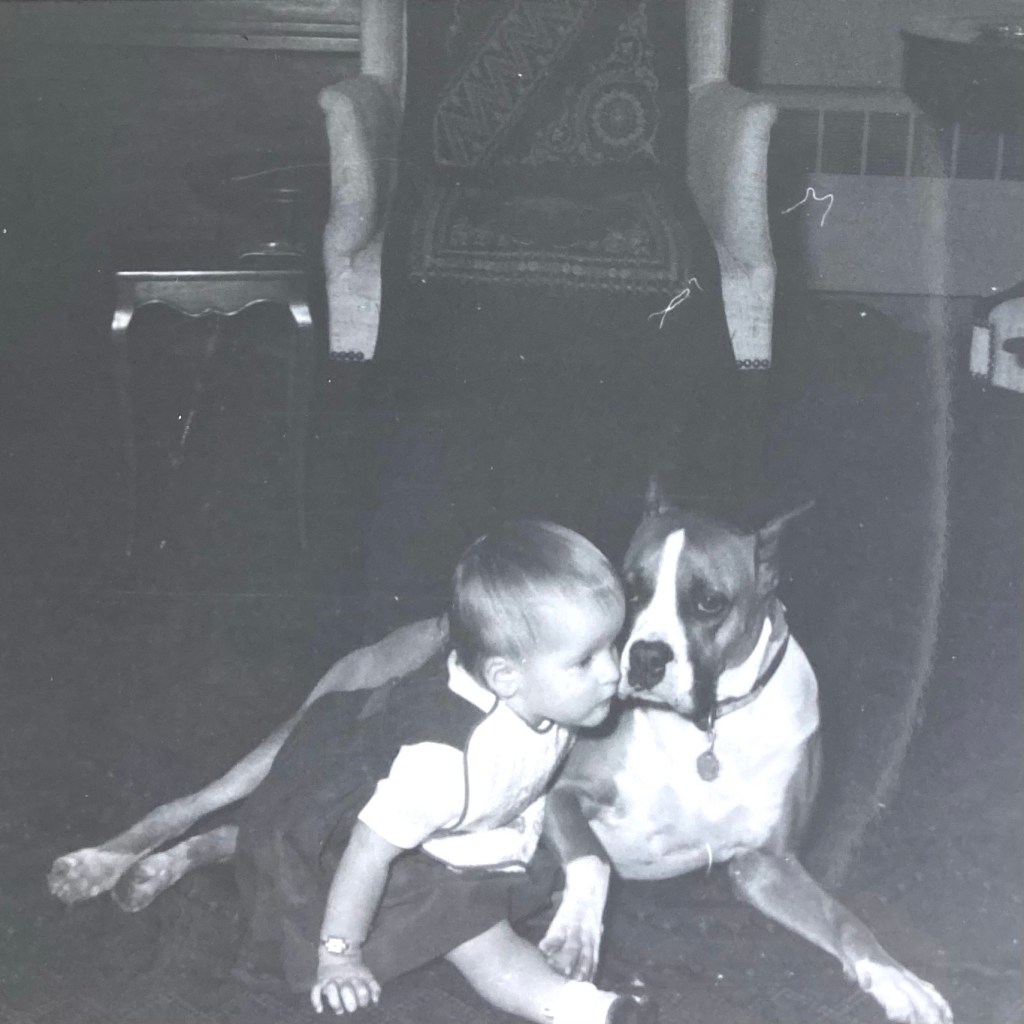 My fourth birthday present was Jeff, a handsome Great Dane, and a great delight to my dad. Family lore is that I was harassing Jeff one day, when my mother heard me shriek. She came running, only to find that Jeff–so much bigger than I was–had gently pinned me to the wall, head on one side of me and tail on the other. He’d had enough! We lived in an apartment in Baltimore near a reservoir. My parents had a VW beetle and exercised Jeff by holding his leash out the car window and slowly driving the loop road around the reservoir. He must have been quite a sight.