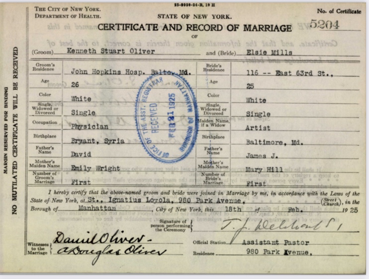 Kenneth Oliver (1898-1975) and Elsie Mills (1899-1993), my grandparents, were married 100 years ago on February 18, 1925 at the Church of St. Ignatius Loyala in Manhattan. Like so many good love stories, theirs had its twists and turns, including the classic “boy-meets-girl;-boy-loses-girl;-boy-gets-girl” plot line. It also had parental obstacles, a rival, and international adventure.