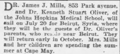 Ken graduated from Haverford College in 1920 and arrived in Baltimore later that year to study medicine at Hopkins. He must have studied with his future father-in-law that first year, because the Baltimore Sun reported on July 13, 1921 that James Mills and Kenneth Oliver were sailing to Beirut on July 20th. They visited Ken’s parents at their orphanage near Beirut, returning to Baltimore in October.