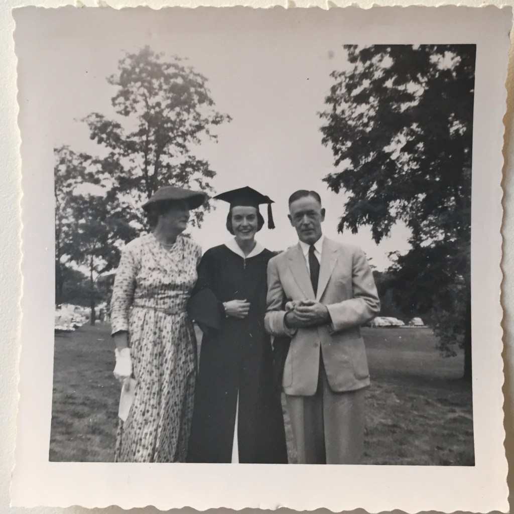 It was a small, simple wedding at the house my grandparents were renting on the campus of Dana Hall School on Grove Street in Wellesley, Massachusetts. My mother wore a dark suit with white piping around the collar. It’s the same suit she was wearing in photos of my Dad’s graduation from Hopkins earlier that month.